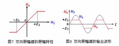 將上、下限幅器組合在一起,就組成了如圖6所示的雙向限幅電路,它的限幅特性如圖7所示。當(dāng)輸入一個(gè)振幅較大的正弦信號(hào)時(shí),輸出波形見圖8。 |
