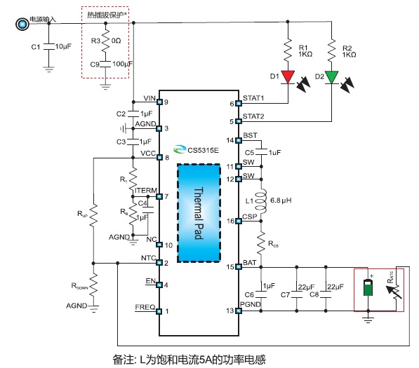 CS5315E具有完善的保護功能,包括輸入欠壓和過壓保護、電池過壓和短路保護、電池溫度保護、芯片溫度 調節(jié)和保護,同時還具備電池反接保護功能。此外芯片通過外接的兩路LED指示燈,可對充電過程實現(xiàn)全程監(jiān)控。