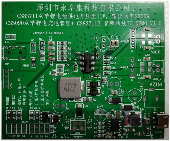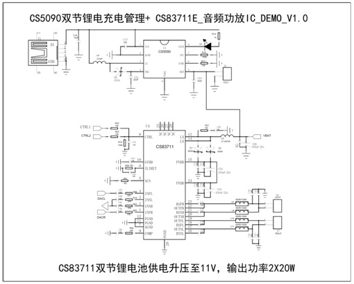 - 采用CS83711功放IC,該芯片6V-9V供電內(nèi)置升壓11V提供2*16W/4歐功率輸出;
