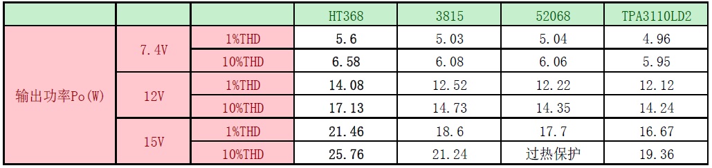 1.HT368輸出功率最大,PVCC=15V, 3815,52068,TPA3110LD2都容易過熱保護。