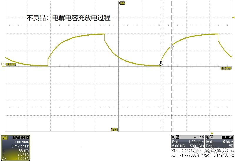 一個(gè)RC的時(shí)間是465ms,所以容量是對的。但是重點(diǎn)來了,電容充電的起始點(diǎn)發(fā)現(xiàn)異常,不是從0開始,而是有一個(gè)固定的電壓。這個(gè)極有可能是電解電容已經(jīng)損壞,或者內(nèi)部寄生阻抗太大,甚至達(dá)到了100歐的級別,導(dǎo)致環(huán)路出現(xiàn)了不穩(wěn)定,震蕩。