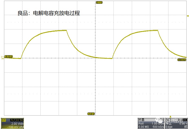 下面把這個(gè)電解電容進(jìn)行測試。把470uF電解電容和1K電阻串聯(lián),加入50%占空比方波做交流源。
