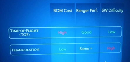 上表是詳細(xì)對比,實際上來說,TOF(Time of Flight)方法在性能上比較占優(yōu),但成本相對更高。而三角測距法則相反,在成本上,它是一種非常占優(yōu)的方案。但是其缺點在于如果軟件的復(fù)雜度不夠高,在進(jìn)行遠(yuǎn)距離的測量的時候,性能就會下降得特別快。