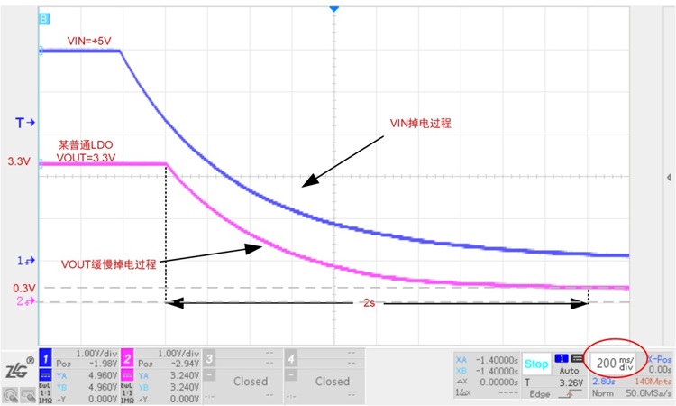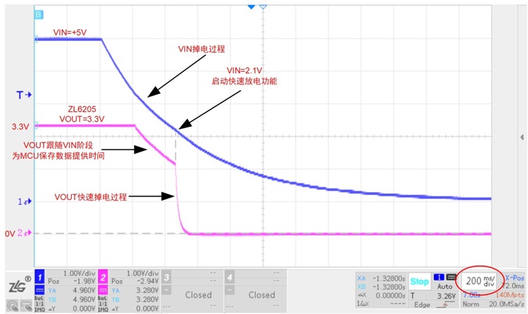 現(xiàn)在使用引腳封裝兼容的ZL6205直接替換上面圖1的普通LDO,然后在相同的電源下進(jìn)行掉電測試。圖4實(shí)測相同的電路下ZL6205的掉電過程。其中藍(lán)色線(通道1)為掉電時(shí)輸入的電壓波形,粉色線(通道2)為掉電時(shí)輸出電壓波形。