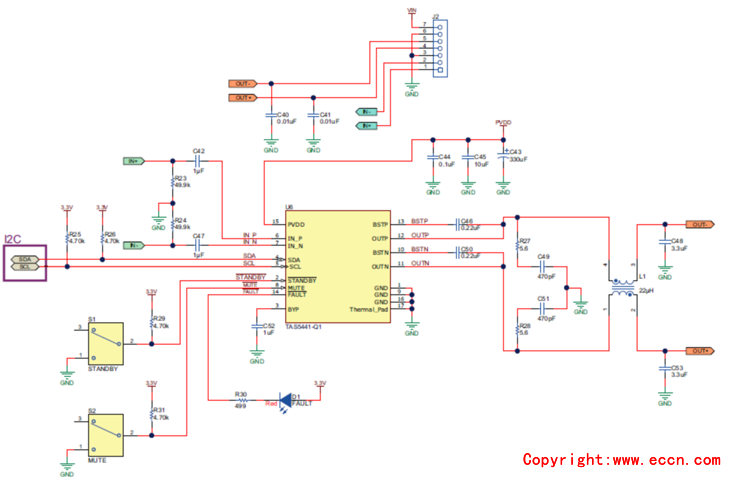 TI公司的TAS5441-Q是單路D類音頻放大器,能從14.4Vdc汽車電池向4 Ω負載提供THD+N小于10%的高達22W功率.滿足 AEC-Q100汽車規(guī)范,工作電壓4.5V到18V, 4 Ω負載時的效率85%,差分模擬輸入,75dB電源抑制比例(PSRR),具有負載診斷功能如開路和短路輸出負載,輸出對電源和輸出對地短路.保護和檢測功能包括有短路保護,40V負載突降保護per ISO-7637-2,播放音樂時輸出DC電平檢測,超溫保護以及過壓和欠壓保護.主要用在汽車緊急呼叫(eCall)放大器,汽車通訊系統(tǒng),儀表盤系統(tǒng)和信息娛樂音頻.本文介紹了TAS5441-Q主要特性,功能框圖,應用電路,評估板TAS5441-Q1 EVM主要特性,電路圖,材料清單和PCB設計圖.