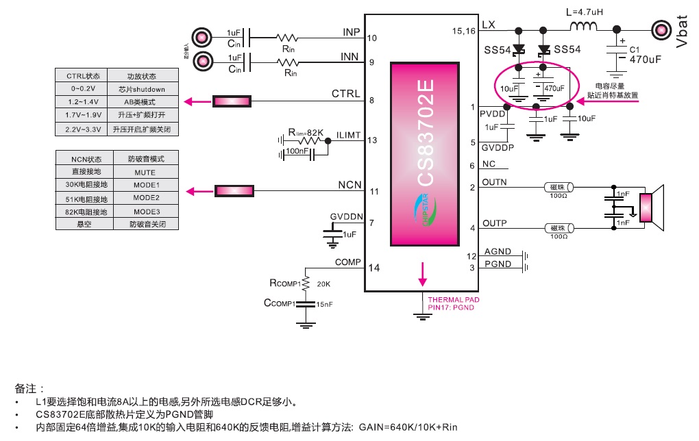 CS83702E是一款適用于單節(jié)鋰電池供電應用,固定增益,帶三種防破音模式,AB/D切換,靜音功能,內(nèi)置BOOST升壓模塊的R類單聲道音頻功率放大器。在單節(jié)鋰電池供電的情況下,CS83702E可以驅動低至2Ω的揚聲器,最大輸出18W的恒定功率;CS83702E AB類D類可切換模式的設計,最大限度的減少音頻子系統(tǒng)中功放對FM的干擾,為終端產(chǎn)品提供了極致的功率輸出.
