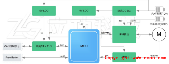 隨著汽車的逐年增長,汽車電動部分的控制也隨之而升,諸如汽車高壓輔助電機、壓縮機、油泵、水泵、渦輪增壓器、各種風(fēng)扇等。雖然傳統(tǒng)的分立式也能滿足需求,但是集成度不高,參數(shù)選型繁瑣,預(yù)驅(qū)和驅(qū)動相結(jié)合,總體設(shè)計較為復(fù)雜,ZLG 基于ON的智能功率模塊推出了適用于汽車三相650V 30A/40A/50A IPM電機控制解決方案,如圖1所示。與普通的IGBT相比,IPM在系統(tǒng)性能及可靠性方面得到進(jìn)一步的提升。