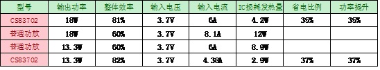 以下表格是跟普遍內(nèi)置升壓功放對比數(shù)據(jù),一般ClassD音頻功放8.7V供電驅(qū)動2Ω負(fù)載效率約75%,DC-DC升壓從3.7V升壓到8.7V效率約80%,整體效率是60%。而CS83702效率是81%,效率比普通內(nèi)置升壓功放高20%。從電池端電流看,同樣的輸出功率CS83702可以省電35%以上,驅(qū)動2Ω負(fù)載普通雙MOS管電池即可滿足要求;同樣的6A輸入電流,普通升壓功放輸出功率13.3W時,CS83702可以輸出18W。同樣的18W輸出功率,普通升壓功放需要輸入電流8.1A,而CS83702只需6A輸入電流。舉例子:驅(qū)動4Ω負(fù)載時,同樣的輸出功率,原來用1800mAh電池?fù)Q用1300mAh電池可以達(dá)到同樣的播放時間。大大降低整機(jī)成本。