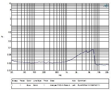 CS83702效率高,功率大的同時,為了保證音質(zhì),在中小音量失真度THD也表現(xiàn)出色:THD+N≤0.026(f=1kHz/Po=1W/RL=4Ω/VBAT=3.7V)。