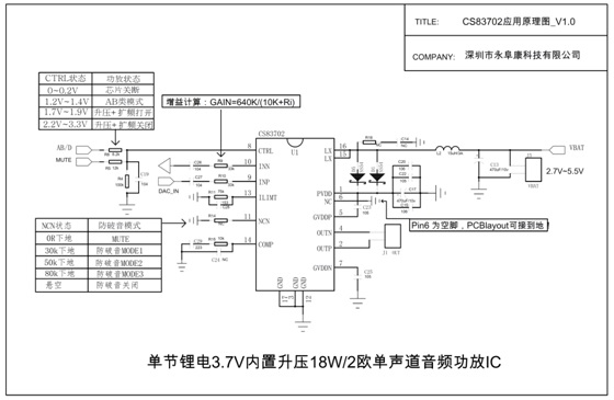CS83702工作電壓范圍是2.7V~5.5V,采用EAQ16封裝,尺寸大小與ESOP-8一致;針對不同的應(yīng)用場合、不同的喇叭腔體需求、CS83702內(nèi)置三種防破音模式可選,靈活方便;另外擴(kuò)頻工作模式在整機(jī)EMI認(rèn)證測試時變得很輕松;AB/D類切換免除收音干擾;CS83702除了性能指標(biāo)優(yōu)秀、音質(zhì)表現(xiàn)突出、應(yīng)用簡單靈活之外,還有著完善的保護(hù)機(jī)制,包括過流保護(hù)、過熱保護(hù)、輸出短路保護(hù)等,實(shí)測輸出正負(fù)兩端短路、輸出對地短路、輸出對電源短路保護(hù)功能準(zhǔn)確無誤。