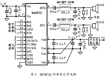 NJU8721的典型應(yīng)用電路如圖3所示。其中3.3V電源電壓加至IC的20腳,開關(guān)電壓調(diào)節(jié)器輸出的3.3~5.25V的穩(wěn)定電壓分別加到IC的5腳和6腳,從而為輸出驅(qū)動器電路提供DC偏置。數(shù)字音頻數(shù)據(jù)從12腳-15腳輸入后,即可通過IC的1腳、9腳、10腳和16-19腳輸入模式控制信號。在IC的4腳和7腳上的PWM信號分別經(jīng)LC濾波器轉(zhuǎn)換后可產(chǎn)生模擬音頻信號以驅(qū)動兩個聲道上的16Ω耳機。