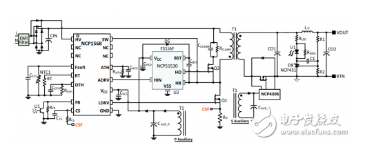 NCP1568提供智能和控制,NCP51530是集成的高、低邊驅(qū)動(dòng)器,在達(dá)700 V的電壓提供兩個(gè)N溝道功率MOSFET的高效功率開關(guān),從而在緊湊的空間實(shí)現(xiàn)高性能的電源方案。NCP51530適用于具有較短傳播延遲以及快速上升和下降時(shí)間的高頻工作。傳輸延遲(5ns)的嚴(yán)格匹配有助于提高所有應(yīng)用的能效。