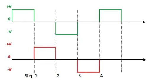 圖 2:雙極步進電機上的兩個線圈必須根據(jù)上圖進行分別驅(qū)動,才能使電機在每次波形變化時運動一整步。首先在一個方向上驅(qū)動每個線圈中的電流;接下來線圈空閑;然后以相反方向驅(qū)動電流。(圖片來源:Digi-Key)