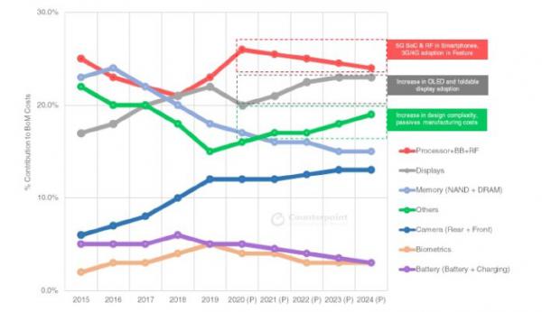 圖2:各組件在手機(jī)BoM總成本中的占比(來源:Counterpoint Research)