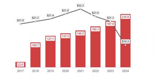 手機(jī)的累計(jì)出貨量(百萬部)和平均售價(jià)(來源:Counterpoint Research)