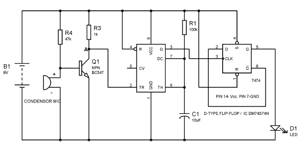 現(xiàn)在我們?cè)陔娙蓰溈孙L(fēng)上產(chǎn)生一些聲音,這股聲能會(huì)轉(zhuǎn)換為電能,從而升高基極上的電平致使三極管導(dǎo)通。一旦三極管導(dǎo)通,A點(diǎn)電平將變低從而因?yàn)榈碗妷海ǖ陀赩cc/3)而觸發(fā)555定時(shí)器。所以輸出引腳3為高,一個(gè)正時(shí)鐘脈沖會(huì)是加到D觸發(fā)器上,使LED打開(kāi)。觸發(fā)器的SET狀態(tài)會(huì)一直保持,直到下一次時(shí)鐘脈沖的到來(lái)。D觸發(fā)器的具體原理在下一部分中講解。