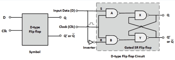 所以D觸發(fā)器基本就是S-R觸發(fā)器的改進(jìn)版。在S-R出發(fā)其中,S=0和R=0的情況是不允許的,因?yàn)檫@會(huì)讓觸發(fā)器的行為充滿不確定性。該問(wèn)題在D觸發(fā)器中解決了,通過(guò)在兩個(gè)輸入之間加入一個(gè)逆變器(見(jiàn)上方原理圖)。而第二輸入則給到去NAND門(mén)的時(shí)鐘脈沖。此處的逆變器是為了避免輸入上的相同邏輯電平,這樣"S=0同時(shí)R=0"的情況就不會(huì)發(fā)生了。