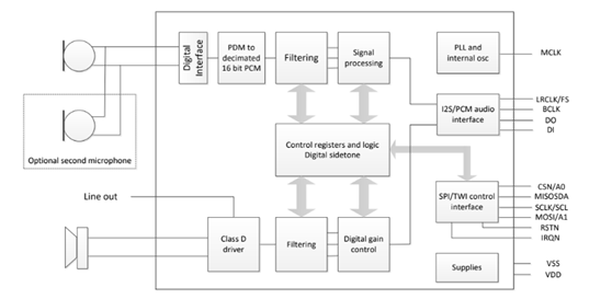 與麥克風的接口長期以來一直由語音編解碼器實現(xiàn),但傳統(tǒng)的編解碼器被設計為與駐極體麥克風兼容,而不兼容現(xiàn)代數(shù)字MEMS麥克風。之前的語音編解碼器缺少與MEMS麥克風端接所需的許多功能,其中包括抽取濾波(decimation filtering),其作用是將PDM轉(zhuǎn)換為PCM格式以便進一步處理。此外,在包括揚聲器和麥克風陣列在內(nèi)的許多應用中,具有更高效率的D類放大器已成為任何MEMS麥克風接口的重要組成部分。