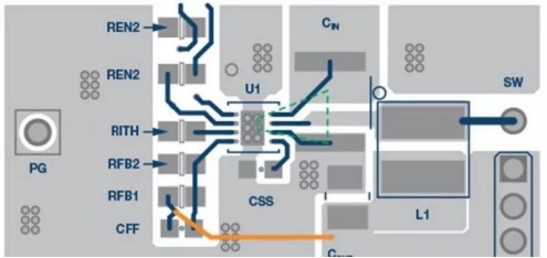 開關(guān)穩(wěn)壓器在兩個不同路徑之間來回切換電流。這種切換非常快,具體切換速度取決于切換邊緣的持續(xù)時間。開關(guān)電流流經(jīng)的走線稱為熱回路或交流電流路徑,其在一個開關(guān)狀態(tài)下傳導(dǎo)電流,在另一個開關(guān)狀態(tài)下不傳導(dǎo)電流。在 PCB 布局中,應(yīng)使熱回路面積小且路徑短,以便 限度地減小這些走線中的寄生電感。寄生走線電感會產(chǎn)生無用的電壓失調(diào)并導(dǎo)致電磁干擾(EMI)。