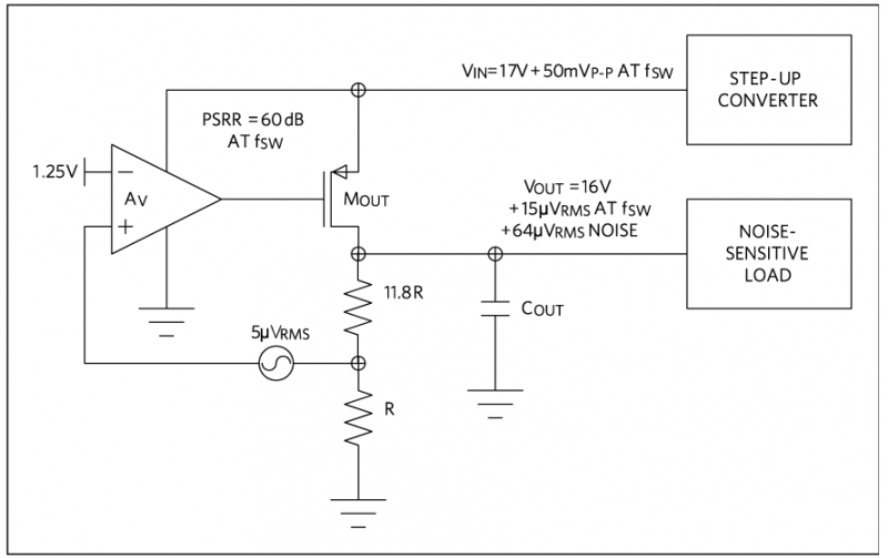 對于較高的輸出電壓,線性穩(wěn)壓器的輸出噪聲可能成為 PSRR 的決定因素。這是因?yàn)榉謮汉蟮姆答佪斎朐肼曉龃罅。假如一個(gè)線性穩(wěn)壓器將噪聲較高的升壓轉(zhuǎn)換器的 17V 輸出轉(zhuǎn)換為噪聲較小的 16V 電源,紋波小于 100uV。開關(guān)頻率處的 PSRR 為 60dB,50mVP-P 升壓轉(zhuǎn)換器紋波將衰減到 50uVP-P,或者輸出噪聲 15uVRMS。如果采用 5uVRMS 低噪聲基準(zhǔn)和反饋運(yùn)放輸入,我們來看一下反饋輸入產(chǎn)生的問題。如果反饋輸入調(diào)整在 1.25V,電阻反饋網(wǎng)絡(luò)將輸出設(shè)置為 16V,那么輸出噪聲將增大到 5uVRMS x (16V/1.25V),即 64uVRMS,這可能成為主要的噪聲源。(圖 5)顯示了高壓輸出造成的輸出噪聲性能下降。