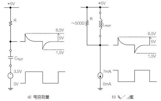 關于該電路的運行,首先請看圖1中所示的基本原理圖。在圖1a中,方波電壓源驅(qū)動被測電容器的底部端子。頂部端子電壓為一系列在+5V電源軌上下呈指數(shù)衰減的正向和負向脈沖。衰減時間常數(shù)自然為R和CTEST的乘積。同樣地,在圖1b中,方波電壓源饋入被測電感器,從而在+5V電源軌上下引起類似的瞬變,此時衰減時間常數(shù)則等于LTEST/R。在電壓呈指數(shù)衰減的過程中,被占用方波的兩個半周各自的比例由時間常數(shù)和振蕩周期之間的關系決定。