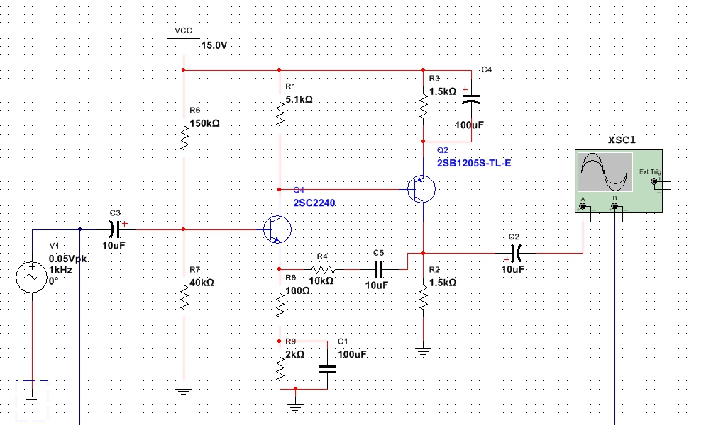 假設(shè)Tr1的發(fā)射級(jí)電流1mA,則可以求得發(fā)射級(jí)電阻的值,在設(shè)計(jì)過(guò)程中,為了滿(mǎn)足使用條件,應(yīng)該盡量增加第一級(jí)電路的放大倍數(shù)來(lái)提高開(kāi)環(huán)增益,但是增加增益的條件是增加及集電極電阻Rc的值,但Rc的值太大,使得Tr2的集電極的電位過(guò)于接近GND,導(dǎo)致不能輸出最大的電壓。這里取集電極的壓降為5V,理論上可以輸出10Vp-p。