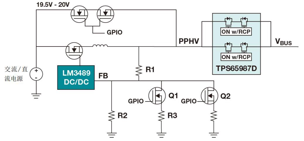 對于這個具體的設計示例,我會使用 TI 的 LM3489 磁滯 p 溝道 FET(PFET)控制器。該集成電路(IC)允許外部 PFET 上 100%的占空比,可直接從 AC/DC 轉換器通過外部 19.5 V。市場上大多數(shù) USB PD 控制器都具有通用輸入/輸出(GPIO),用于控制外部穩(wěn)壓器輸出電壓。PD 控制器可以通過調(diào)節(jié)降壓的反饋網(wǎng)絡來調(diào)整 LM3489 DC/DC 降壓轉換器的輸出電壓。