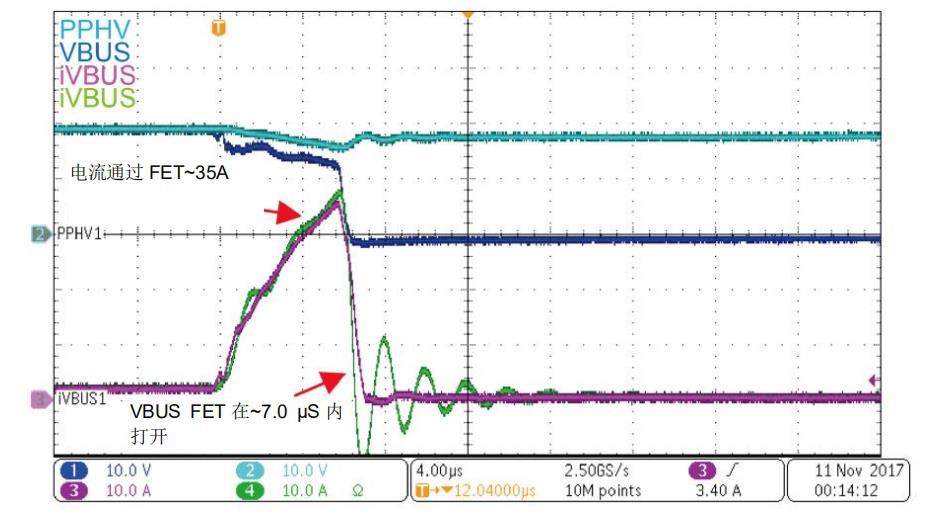 圖4重點說明了在具有適當保護的電源路徑的VBUS對地短路期間會發(fā)生的情況。當VBUS上的電流迅速上升至約35 A時,USB PD控制器檢測到此大電流并立即斷開FET。VBUS對地短路保護必須通過硬件比較器作為固件來實現(xiàn)。固件實現(xiàn)無法足夠快速地做出反應以保護電源路徑和系統(tǒng),這種電源路徑快速關斷可在發(fā)生硬短路時保護系統(tǒng)和FET。