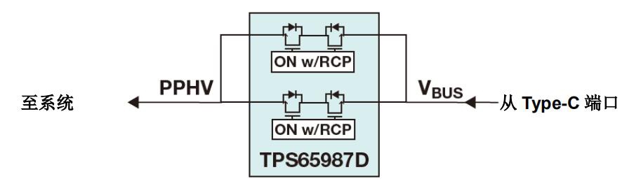 根據(jù) USB PD 協(xié)議,在其配置通道(CC)線路上帶有RD 的設備必須將 DC/DC 控制器的輸出電容與 VBUS 隔離。在這種情況下,系統(tǒng)必須具有 VBUS FET 以滿足此協(xié)議。TPS65987D 有兩個高壓背對背集成 FET,可滿足此要求。TPS65987D 中的內(nèi)部 FET 在 25°C 環(huán)境溫度下的 RDS(on)約為 25mΩ。對于高電流應用,此電阻可能太高。當 5 A 的電流通過其中一個內(nèi)部 FET 時,F(xiàn)ET中將消耗大約 750 mW 的功率。通過雙電源模式,TPS65987D 能夠同時并聯(lián)關閉其兩個內(nèi)部電源路徑。這種模式有效地將電源路徑的 RDS(on)減半,并且還使FET 內(nèi)部的功耗減半。圖 3 重點說明了 PD 控制器如何與此電源架構連接。