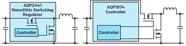 開關(guān)穩(wěn)壓器可以采用單片結(jié)構(gòu),也可以通過控制器構(gòu)建。在單片式開關(guān)穩(wěn)壓器中,各功率開關(guān)(一般是MOSFET)會(huì)集成在單個(gè)硅芯片中。使用控制器構(gòu)建時(shí),除了控制器IC,還必須單獨(dú)選擇半導(dǎo)體和確定其位置。選擇MOSFET非常耗費(fèi)時(shí)間,且需要對開關(guān)的參數(shù)有一定了解。使用單片式設(shè)計(jì)時(shí),設(shè)計(jì)人員無需處理這些問題。此外,相比高度集成的解決方案,控制器解決方案通常會(huì)占用更多的電路板空間。所以,毫不意外多年來人們越來越多地采用單片式開關(guān)穩(wěn)壓器,如今,即使對于更高功率,ADI公司也有大量的解決方案可供選擇。圖1左側(cè)是單片式降壓轉(zhuǎn)換器,右側(cè)是控制器解決方案。