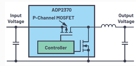 圖 3 所示為開關穩(wěn)壓器 ADP2370,該穩(wěn)壓器通過將 P 通道 MOSFET 用作高壓側開關來實現(xiàn) 100%占空比。對于這種類型的降壓轉換器,輸入電壓可以降低至非常接近輸出電壓。將 P 通道開關集成到開關穩(wěn)壓器中,可以避免產(chǎn)生額外成本。