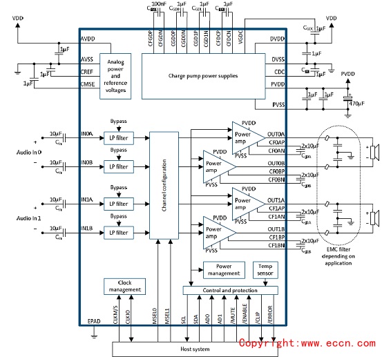 · Protection: power supply reverse polarity and hot-plug, thermal, DC and speaker short-circuit