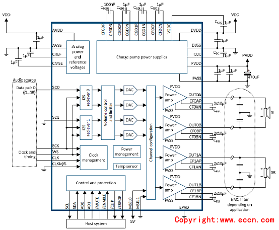 • Supply Voltages: +4V to +26V (PVDD) and +5V(A/DVDD)