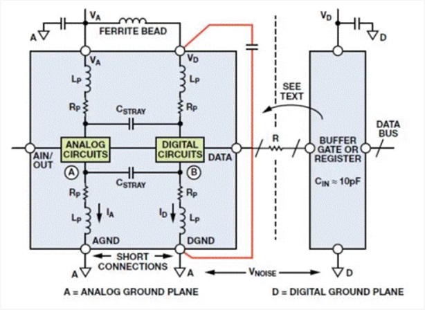 不過(guò),為了防止進(jìn)一步耦合,AGND 和 DGND 應(yīng)通過(guò)最短的引線在外部連在一起,并接到模擬接地層。DGND 連接內(nèi)的任何額外阻抗將在 B 點(diǎn)產(chǎn)生更多數(shù)字噪聲;繼而使更多數(shù)字噪聲通過(guò)雜散電容耦合至模擬電路。請(qǐng)注意,將 DGND 連接到數(shù)字接地層會(huì)在 AGND 和 DGND 引腳兩端施加 VNOISE,帶來(lái)嚴(yán)重問(wèn)題!