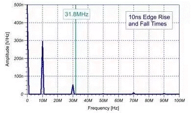 10ns 邊緣率時(shí)方程式結(jié)果為約 31.8MHz。曲線圖顯示,最后一次明顯諧波出現(xiàn)在 30MHz。同時(shí),1ns 邊緣率時(shí)方程式結(jié)果為 318MHz 最大頻率(圖 2 所示)。如果您的電路易受 318MHz 頻帶內(nèi)產(chǎn)生的頻率影響,則 EMI 諧波可能會(huì)使您的電路出現(xiàn)干擾。