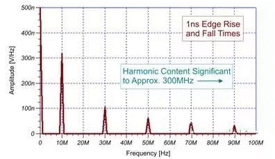 您可以將某個(gè)數(shù)字信號(hào)的頻譜成分簡(jiǎn)化為頻率和上升時(shí)間。時(shí)鐘或者系統(tǒng)頻率建立電路的時(shí)間基準(zhǔn),但其邊緣率形成干擾諧波。圖 1 顯示了一個(gè) 10MHz 方波的頻譜成分。該 10MHz 信號(hào)的邊緣率為 10ns。請(qǐng)注意,圖 1 中這些諧波的量級(jí)隨頻率降低。一般而言,這種信號(hào)的潛在 EMI 為: