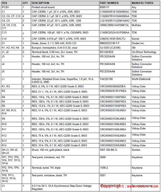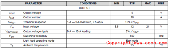 TI公司的TPS51397A是單片4.5V-24V 10A帶ULQ™操作的同步降壓轉(zhuǎn)換器,集成的MOSFET具有高效率和容易使用,外接元件數(shù)量最少,從而節(jié)省了電源系統(tǒng)的空間. TPS51397A采用D-CAP3™控制,提供內(nèi)部補(bǔ)償?shù)淖羁斓乃矐B(tài)響應(yīng)和極好的線路和負(fù)載調(diào)整.ULQ™ (超低靜態(tài)電流)在低功耗工作中延成電池壽命有極大的好處.器件的輸入電壓為4.5V到24V,輸出電壓為0.6V到5.5V,支持10A連續(xù)電流輸出,0.6 V ± 1%反饋精度(25C).集成的17-mΩ和5.9-mΩ FET,通過MODE引腳可選擇Eco-mode™和Out-of-Audio™,500kHz和800kHz可選擇開關(guān)頻率,可選擇軟起動(dòng)時(shí)間,默認(rèn)間隔1.2ms,大占空比操作,集成了功率良好指示器,內(nèi)置輸出放電功能,逐個(gè)周期的過流保護(hù),閉鎖輸出OV和UV保護(hù),非閉鎖UVLO和OT保護(hù),工作結(jié)溫度-40C 到125C,23引腳3.0x3.0 mm HotRod™ VQFN封裝.主要用在筆記本和PC電腦,超級(jí)本,手持平板計(jì)算機(jī),工業(yè)PC<單板計(jì)算機(jī)和分布電源系統(tǒng).本文介紹了TPS51397A主要特性,功能框圖, 5V 10A參考設(shè)計(jì)電路圖及其參考設(shè)計(jì)主要參數(shù),以及評(píng)估模塊TPS51397AEVM主要特性,電路圖,材料清單和PCB設(shè)計(jì)圖.