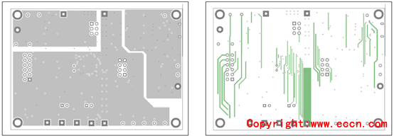 圖15.評估板MAX17320G EVK PCB設(shè)計(jì)圖(2):左:層2;右:層3