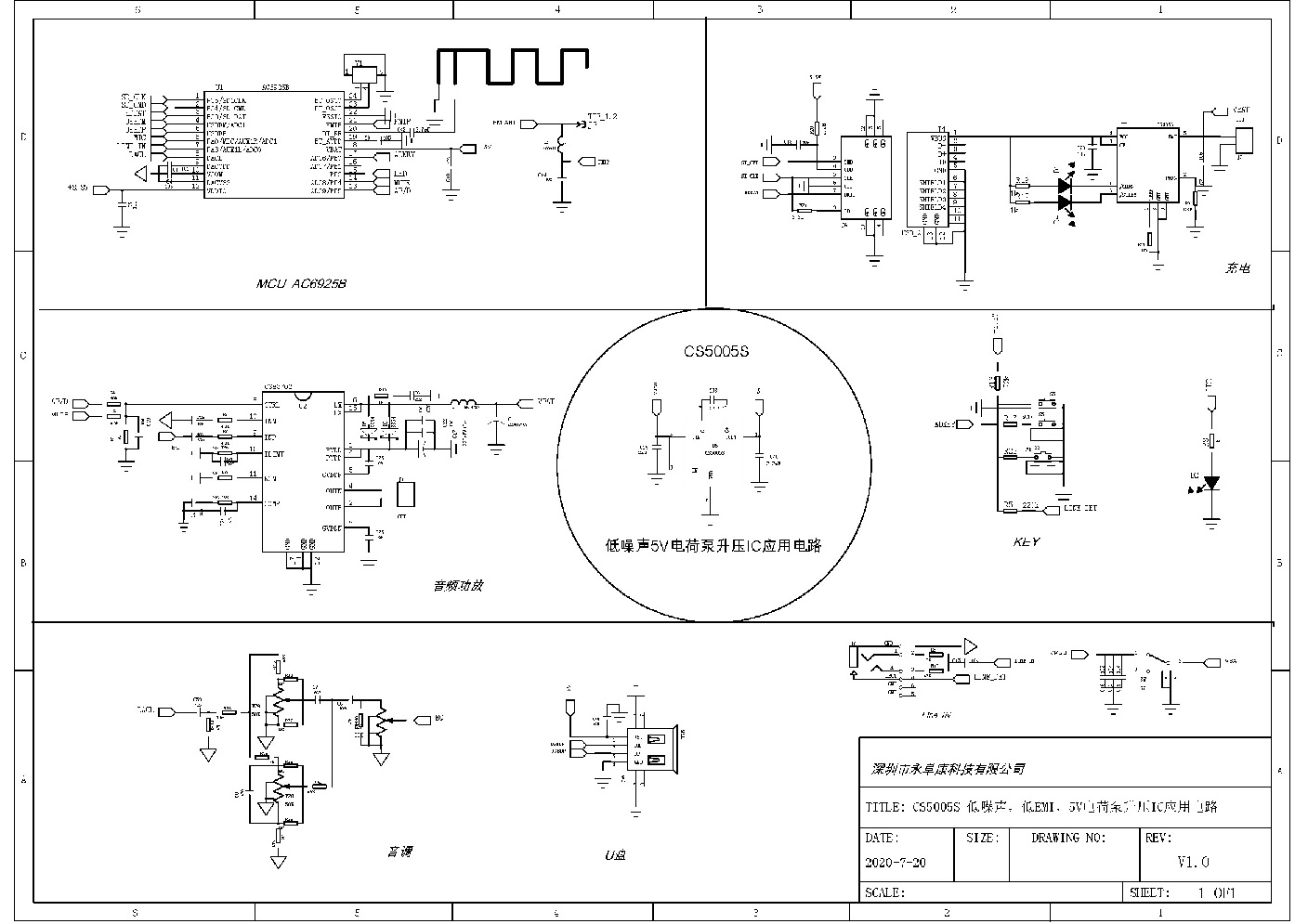 5V是很多器件以及電路標(biāo)準(zhǔn)的供電電壓。針對(duì)音箱的應(yīng)用場(chǎng)景,一般帶LED顯示屏主控供電電流約50mA,無(wú)線麥接收板電流約100mA,加上U盤(pán)等其他電路一起最大電流約200mA。另外還必須考慮升壓輸出紋波以及噪聲,不然會(huì)影響系統(tǒng)的信噪比。再有就是EMI特性,直接影響FM收音效果以及無(wú)線麥接收距離和清晰度,考慮外圍成本,EMI輻射干擾,電荷泵升壓方式是最佳選擇。