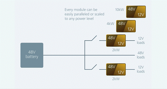 •混合動(dòng)力車:根據(jù)不同分布式負(fù)載的電源分析,可以設(shè)計(jì)一個(gè)模塊并對(duì)其進(jìn)行適當(dāng)功率粒度及擴(kuò)展性認(rèn)證,用于并行陣列擴(kuò)展。通過(guò)使用分布式模塊代替大型集中式 DC-DC 轉(zhuǎn)換器,能夠以顯著降低的成本實(shí)現(xiàn) N+1 冗余。如果在汽車開(kāi)發(fā)階段負(fù)載功率有變,該方法依然有優(yōu)勢(shì)。工程師可以增減模塊,無(wú)需對(duì)整個(gè)已完成定制電源進(jìn)行修改。另一個(gè)設(shè)計(jì)優(yōu)勢(shì)是縮短開(kāi)發(fā)時(shí)間,因?yàn)槟K已獲得了相應(yīng)認(rèn)證。