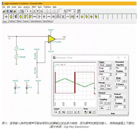 如果比較器輸入端存在噪聲或雜散信號,則可能會發(fā)生多次閾值交叉且輸出可能會隨著閾值交叉進(jìn)行多次轉(zhuǎn)換(圖 2)。