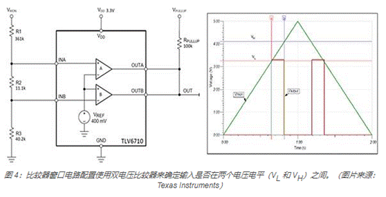 單電壓比較器可以檢測輸入電壓是高于還是低于參考閾值。確定輸入電壓是否在兩個極限之間時(稱為開窗),需要使用兩個比較器,每個極限值使用一個比較器(圖 4)。