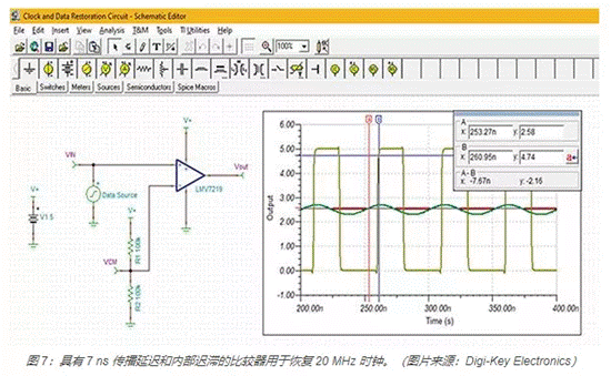 通過背板和電纜傳輸?shù)臅r鐘信號會因帶寬限制、碼間干擾 (ISI)、噪聲、反射和串?dāng)_導(dǎo)致性能下降。比較器可用于恢復(fù)時鐘信號并將其恢復(fù)為更清晰定義的形式(圖 7)。