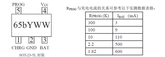 TP4065為SOT23-5封裝,相比TP4067少一個(gè)STDBY引腳,單燈指示;充電紅燈亮,充滿紅燈滅;