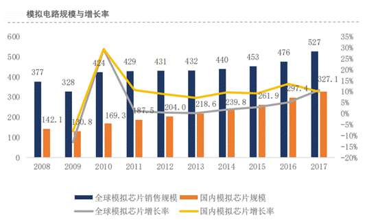 1.市場規(guī)模:模擬芯片全球規(guī)模達到527億美元,國內(nèi)規(guī)模達到327億美元,占據(jù)全球份額的62%。國內(nèi)增長速度高于國際市場。
