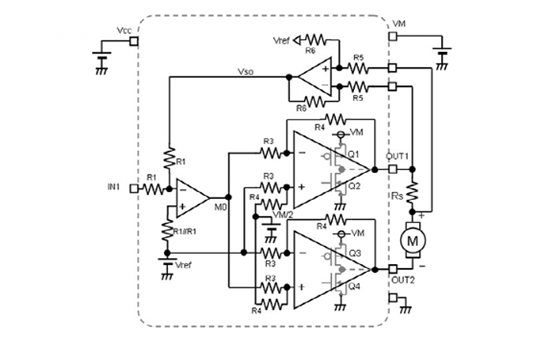 在電機和輸出OUT1之間插入了用來檢測電流的電阻Rs,流經(jīng)電機的電流被檢測為電壓,并被負反饋到輸入級放大器。輸入級反相放大器根據(jù)該反饋對兩個輸出級功率放大器的輸出電壓進行反饋控制。輸出級放大器是差分放大器,OUT1放大器使用反相輸入端接收輸入級放大器的輸出M0,而OUT2放大器使用同相輸入端接收,因此OUT2變成與OUT1相反的相位?傮w而言,可以將其視為單端輸入差分輸出(正相/反相)放大器。
