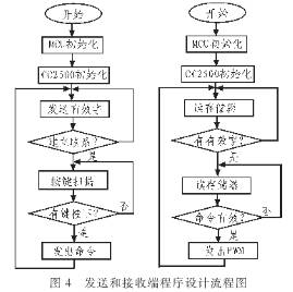 系統(tǒng)軟件的設(shè)計(jì)主要是MSP430F2249內(nèi)部的初始化和射頻芯片CC2500寄存器的設(shè)置以及發(fā)射、接受數(shù)據(jù)的讀寫操作。調(diào)用SimpliciTI協(xié)議棧中的BSP,MRFI,NWK,NWK APPLI CATION,其中BSP是最基礎(chǔ)的板級(jí)硬件,MCU初始化CC2500函數(shù)以及LED、按鍵操作函數(shù);MRFI是屬于射頻接口層,提供射頻芯片的選擇,射頻芯片的配置參數(shù),射頻芯片的驅(qū)動(dòng)以及通信接口,NWK和NWK_APPLICATION是網(wǎng)絡(luò)層和網(wǎng)絡(luò)應(yīng)用層,屬于SimpliciTI協(xié)議棧的內(nèi)容,包括網(wǎng)絡(luò)的建立,網(wǎng)絡(luò)地址的分配,網(wǎng)絡(luò)數(shù)據(jù)幀結(jié)構(gòu)、數(shù)據(jù)消息隊(duì)列,數(shù)據(jù)消息處理,網(wǎng)絡(luò)通信安全加密等一系列復(fù)雜機(jī)制,通過簡(jiǎn)單的函數(shù)調(diào)用實(shí)現(xiàn)了基本的硬件操作。無線收發(fā)器發(fā)送端和接收端的軟件設(shè)計(jì)流程圖如圖4所示。