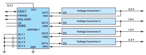 圖2.ADM1186-1模擬時(shí)序控制器解決方案,最多可監(jiān)控四個(gè)電壓轉(zhuǎn)換器