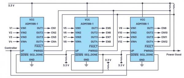 圖3.多個(gè)ADM1186-1器件鏈接在一起,可控制12個(gè)電壓的上電和關(guān)斷時(shí)序