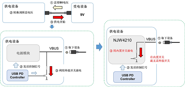 §   在USB PD應(yīng)用中,由于設(shè)備被取下時需要對輸出電壓進行放電,所以在以往的電源配置中需要追加放電開關(guān)。NJW4210內(nèi)置了與USB控制器信號聯(lián)動的輸出放電電路,所以不需要追加外接部件。